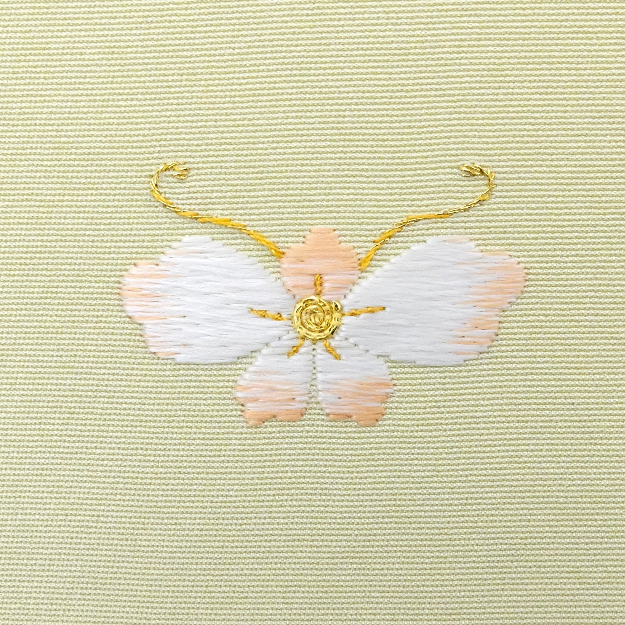 五弁の花を蝶に見立てた可愛らしい家紋です。白からサーモンピンクへと移り変わる花弁と、芽吹きを感じさせる若菜色の生地。そして蝶の軽やかさが合わさって、春の訪れを感じさせます。