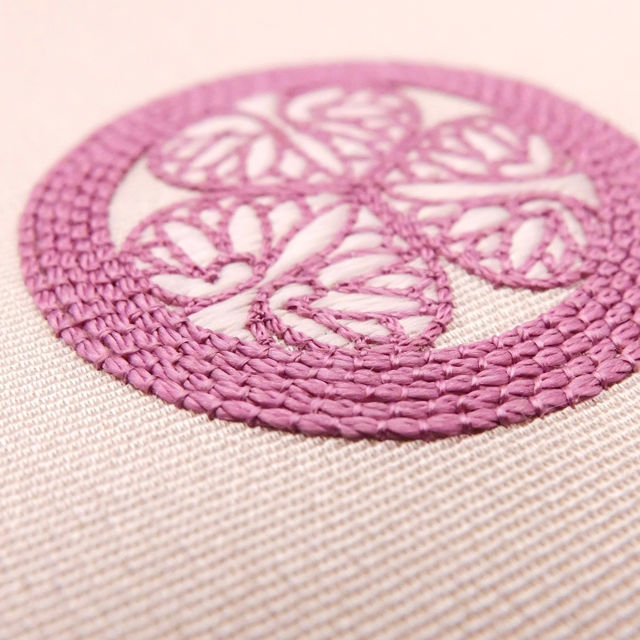 有名な葵の家紋ですが、印象をガラリと変えるような赤紫色の糸で刺繍しました。「駒繍」という技法を使って細かな線も丁寧に表現しました。目立たないところですが、葵のベースに白糸を使ったことで全体がスッキリしたかと思います。薄藤色の生地も相まって、上品な作品に仕上がりました。