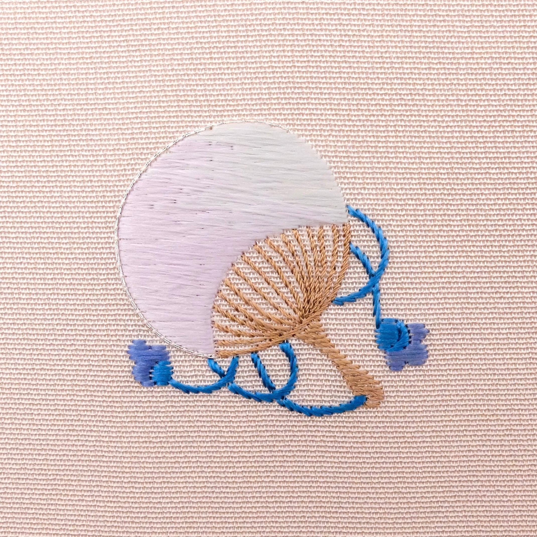藤色と水色のぼかしが重なり合う、優しく穏やかな配色です。団扇の周りを銀糸でくくることで、涼しい風がふわっと流れてきそうな、清らかな仕上がりに。夏の暑い日、ふと目を向けて心まで涼ませたくなるような作品です。