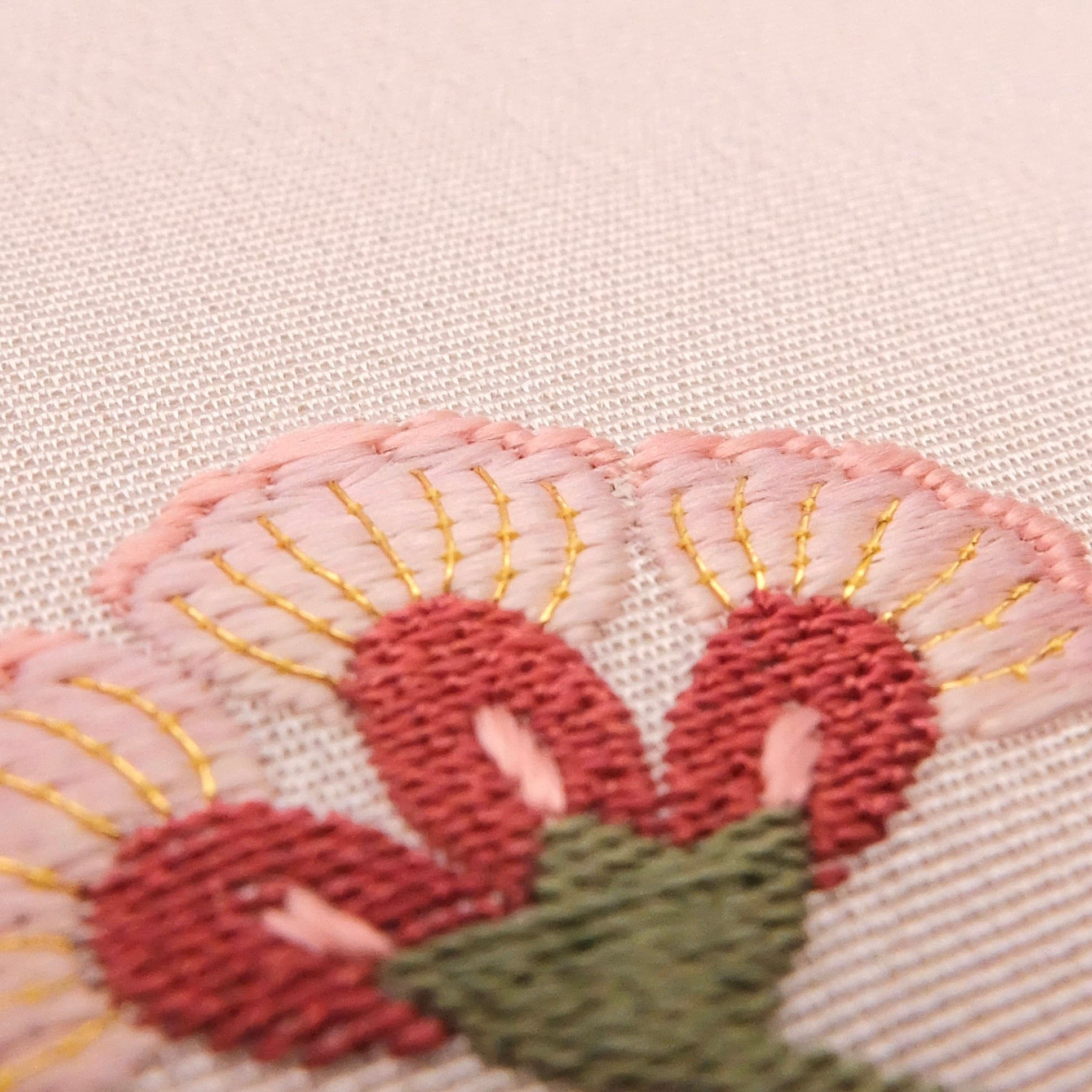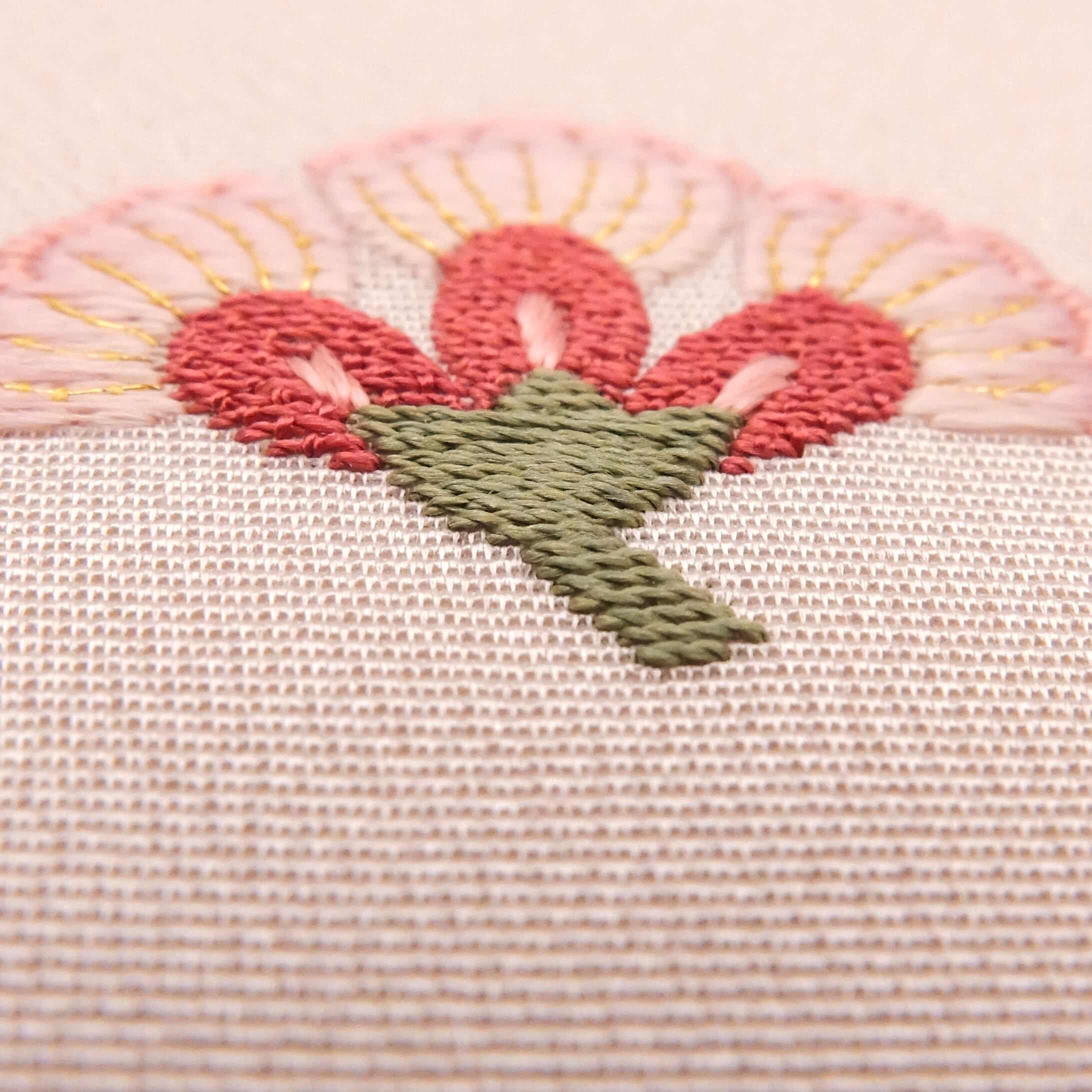 よく見ると、小さな花びらの先が繊細なグラデーションになっています。細かな色の重なり、繊細な一本の線、そして遊び心を添えた「変わり繍」。この小さな家紋の中に、手仕事のこだわりをぎゅっと詰め込みました。