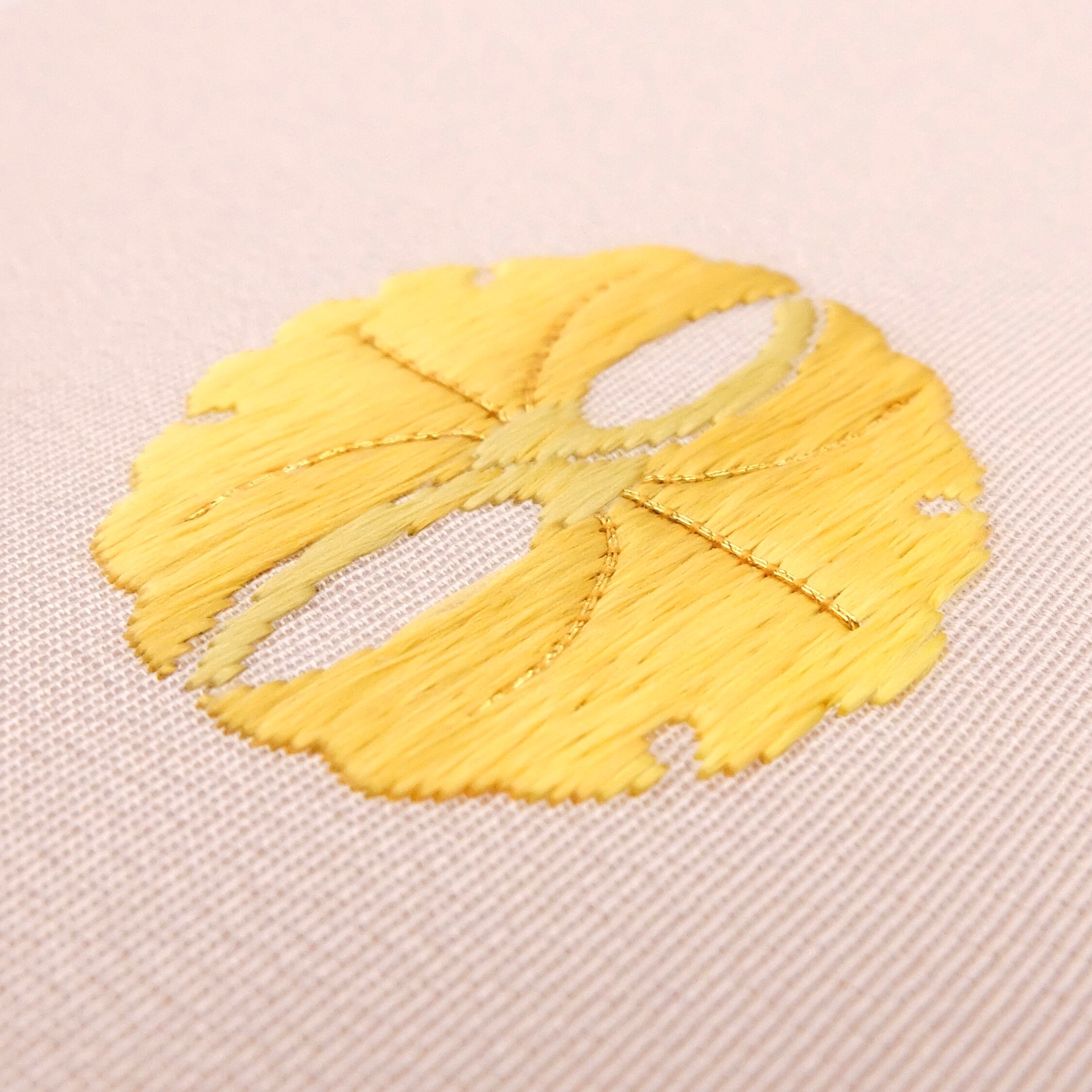 美しい銀杏並木を思い出すような、黄金色の銀杏を目指して刺繍しました。銀杏の色も一色ではなく、緑がかったくすんだ黄色や橙みのある黄色を組み合わせることで、深みと奥行きのある表情に仕上げています。すべて撚りのかかっていない平糸を使用しているため、光を優しく受け止める、ふんわりとした光沢を感じていただけます。ぜひお手元で楽しんでいただきたい作品です。