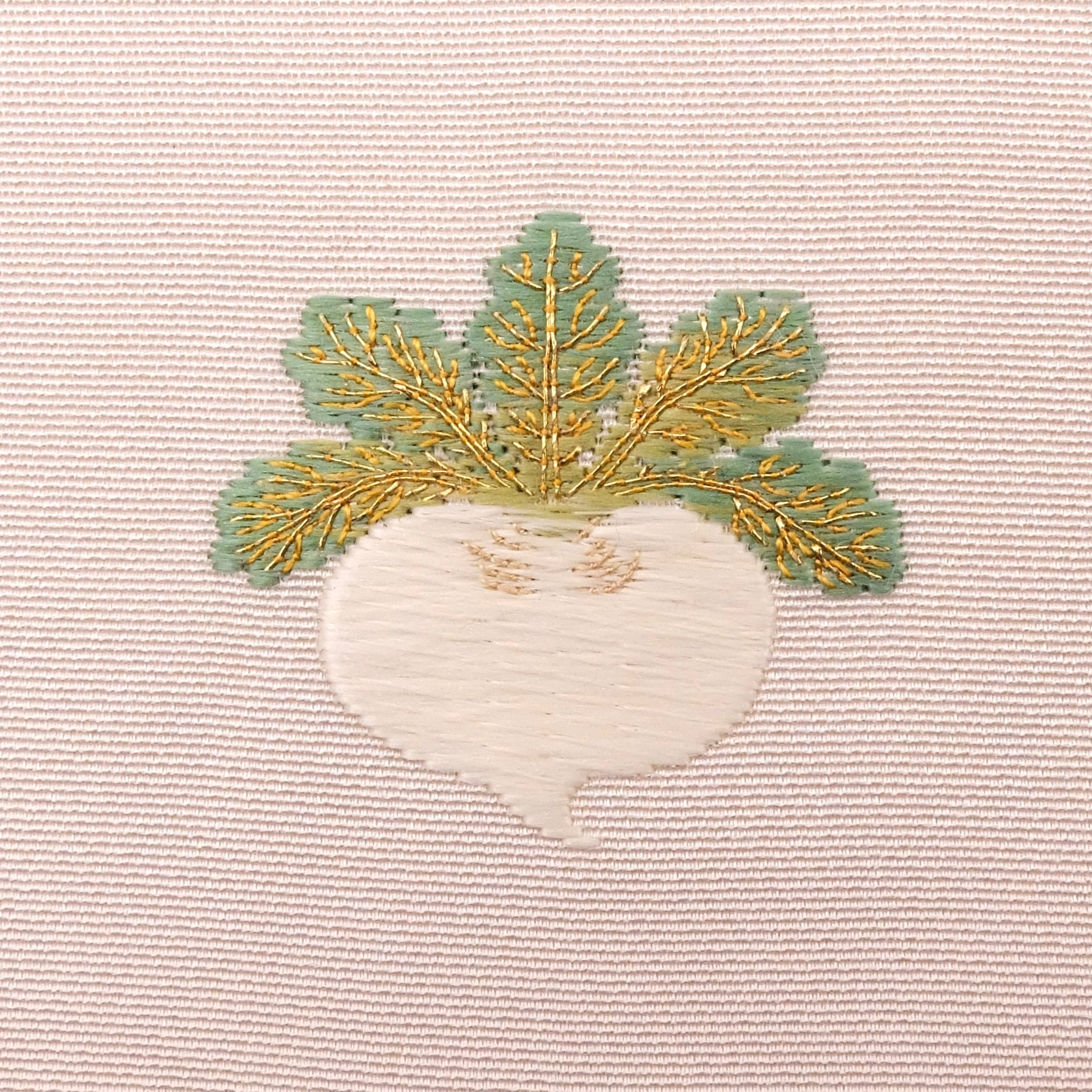 この作品も、蕪特有のぽってりとした丸みのある形に魅せられて刺繍しました。蕪の実の「真っ白ではない白」の絶妙なニュアンスと、葉にほどこした柔らかな「ぼかし」に、手仕事のこだわりを込めています。