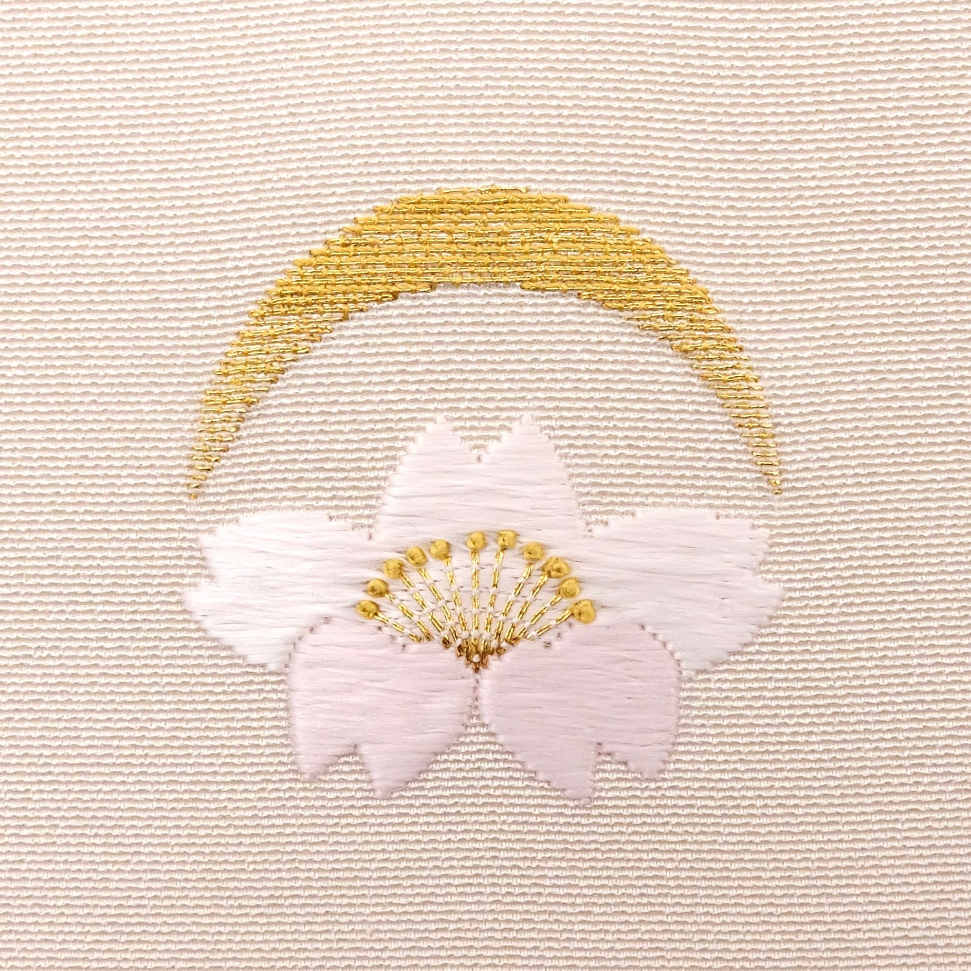 「月落」と「落桜」。それは、月が沈みゆく夜明け前、静かに舞い散る桜の情景。その儚い一瞬を表現するため、桜の花の中心(におい)には、あえて鮮やかな黄色ではなく、落ち着いた「金茶」を選びました。月を彩る金糸の中にも、光を主張しすぎないよう金茶を忍ばせることで、沈みゆく月の穏やかな余韻を込めています。