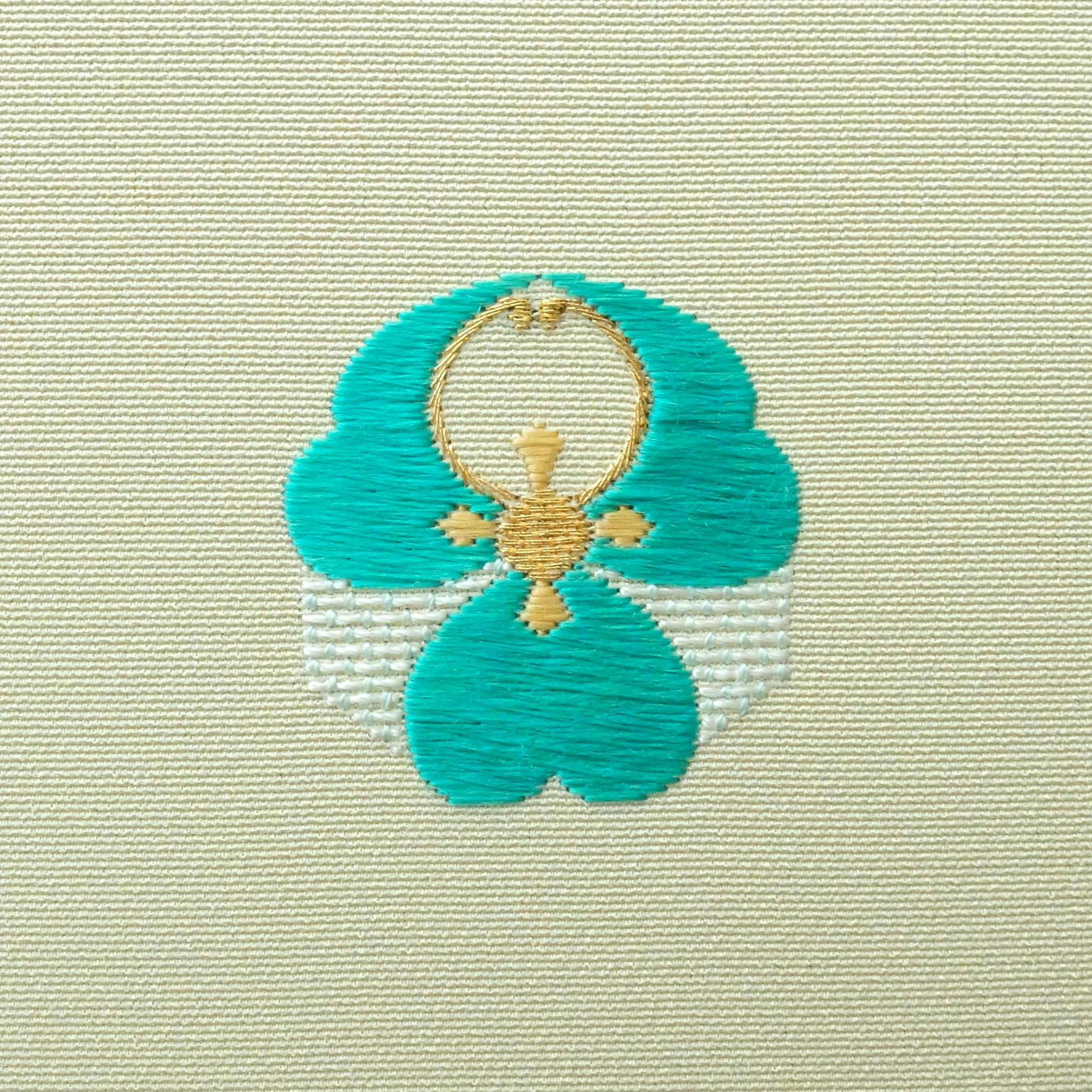 今回は、青とも緑ともつかない絶妙な鮮やかさを主役に据え、変わり繍を交えて表情豊かに刺繍しました。本金糸の繊細なきらめきと、絹糸ならではのふんわりとした柔らかな質感が生み出すコントラストを、心ゆくまで楽しんでいただける作品です。